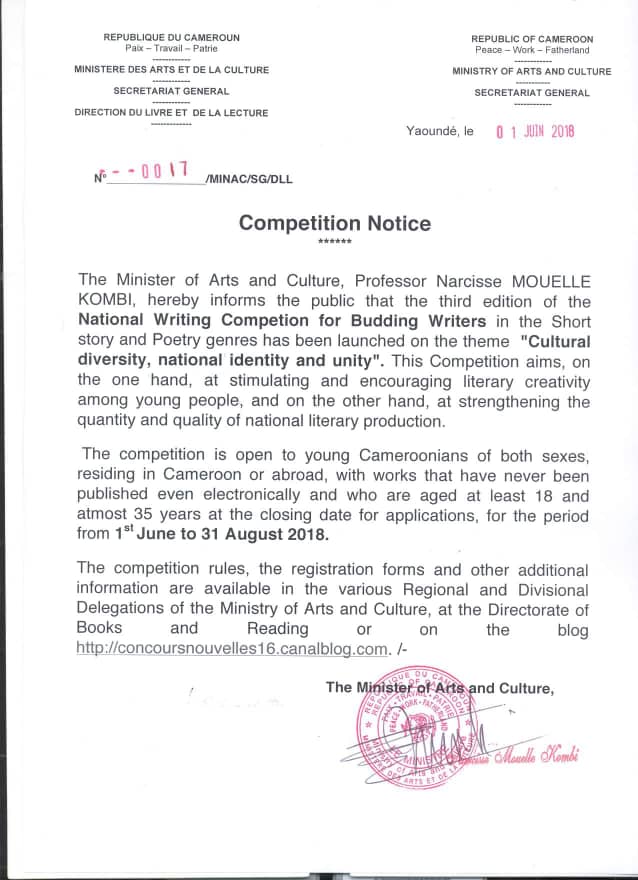 Non classé MINAC : Avis de concours littéraire national jeunes auteurs by Hiatsoon 01 5 juin 2018 written by Hiatsoon 01 5 juin 2018 0 comments 105 Share 0 FacebookTwitterPinterestThreadsBlueskyEmail Hiatsoon 01 Administrateur previous post Batchuetio: Obsèques de Maman NGOUANA Lydie, 1930 – 28 mai 2018 next post C’est à la maison qu’on apprend à… You may also like Les réalisations de la Mairie dans le Groupement Batcham de 2013 à 2019 3 février 2020 Roger Mondoué et Aristide Yemmafouo, désormais Professeurs titulaires des Universités 23 décembre 2019 Réflexion sur le développement de Batcham 24 novembre 2019 Album 02 : Cérémonie d’installation du Chef de la Communauté Batcham de Yaoundé, images... 4 novembre 2019 Grand dialogue national : les anglophones parlent 5 octobre 2019 JUVENTUS de zuac zuac et ATHLETICO de Toumgwang qualifiées pour les demi-finales de la... 24 juin 2019 Leave a Comment Cancel Reply Save my name, email, and website in this browser for the next time I comment.