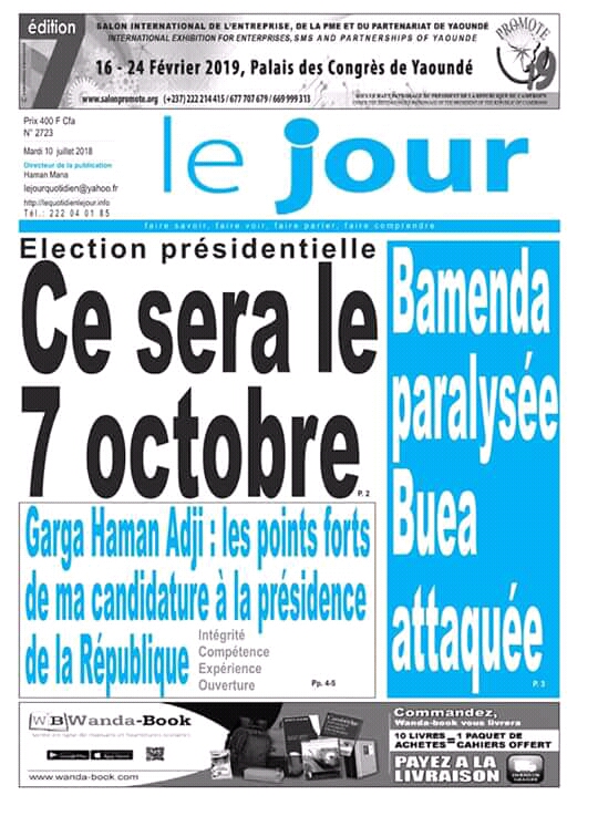 Actes et MessagesActualitéAgendaAu QuotidienBon à savoir !CamerounCommunautésPolitique L’élection présidentielle aura lieu au Cameroun le dimanche 7 octobre 2018 by Hiatsoon 01 10 juillet 2018 written by Hiatsoon 01 10 juillet 2018 0 comments 100 Share 0 FacebookTwitterPinterestThreadsBlueskyEmail Hiatsoon 01 Administrateur previous post Pourquoi je boycotte Nollywood ? next post Comment se débarrasser des cafards qui sont dans votre maison You may also like Communiqué COBADE 17 juin 2023 Vidéo : Dagondland au service de la Jeunesse scolaire de Batcham Chefferie 7 juin 2023 L’eau potable coule dans le Secteur King Place 30 mars 2023 Qui est le Pr Luc Djoussé ? 15 mars 2023 Message du Chef Supérieur à l’occasion de la sortie du premier numéro du journal... 15 mars 2023 Le symbolisme ou le message du masque dans la tradition africaine, par le Pr... 14 mars 2023 Leave a Comment Cancel Reply Save my name, email, and website in this browser for the next time I comment.