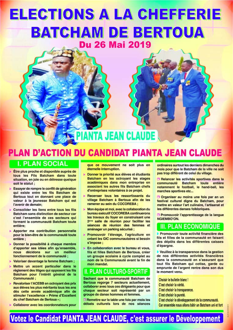 CommunautésDiaspora BatchamFE Bertoua Vidéo : Élection du nouveau Chef de la Communauté Batcham de Bertoua by Hiatsoon 01 31 mai 2019 written by Hiatsoon 01 31 mai 2019 0 comments 122 Share 0 FacebookTwitterPinterestThreadsBlueskyEmail Hiatsoon 01 Administrateur previous post COBADE : le deuxième conseil de cabinet du nouveau Chef de la Communauté s’est tenu le 26 mai 2019 next post Vidéo : 1ère sortie publique du nouveau Chef de la Communauté Batcham de Douala You may also like Vidéo : Dagondland au service de la Jeunesse scolaire de Batcham Chefferie 7 juin 2023 L’eau potable coule dans le Secteur King Place 30 mars 2023 Qui est le Pr Luc Djoussé ? 15 mars 2023 Message du Chef Supérieur à l’occasion de la sortie du premier numéro du journal... 15 mars 2023 Le symbolisme ou le message du masque dans la tradition africaine, par le Pr... 14 mars 2023 Hommage à Tané Jou Tadifo Pierre François 14 mars 2023 Leave a Comment Cancel Reply Save my name, email, and website in this browser for the next time I comment.