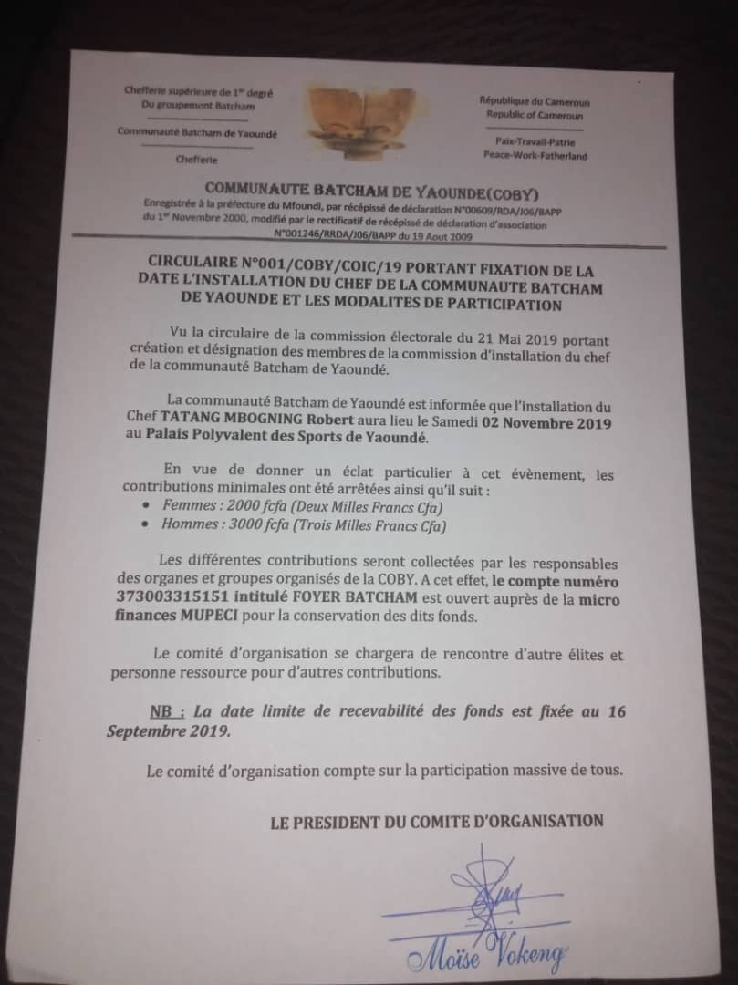 COBYCommunautésDiaspora Batcham COBY: le Chef de la Communauté sera installé le 02 novembre 2019 by Hiatsoon 01 16 juin 2019 written by Hiatsoon 01 16 juin 2019 0 comments 114 Share 0 FacebookTwitterPinterestThreadsBlueskyEmail Hiatsoon 01 Administrateur previous post COBADE : les couleurs des équipes de la Coupe du Chef sont connues next post Tournoi fraternité COBY : résultats de la 2e journée aller de la coupe You may also like Vidéo : Dagondland au service de la Jeunesse scolaire de Batcham Chefferie 7 juin 2023 L’eau potable coule dans le Secteur King Place 30 mars 2023 Qui est le Pr Luc Djoussé ? 15 mars 2023 Message du Chef Supérieur à l’occasion de la sortie du premier numéro du journal... 15 mars 2023 Le symbolisme ou le message du masque dans la tradition africaine, par le Pr... 14 mars 2023 Hommage à Tané Jou Tadifo Pierre François 14 mars 2023 Leave a Comment Cancel Reply Save my name, email, and website in this browser for the next time I comment.