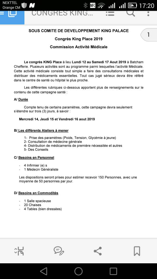 Sur interrogation des uns et des autres tant inbox que lors des rencontres par rapport aux activités à mener au congrès *KING PLACE 2019,* je vais vous faire part ici et afin que nul en ignore, du programme concernant l’activité médicale qui devra meubler entre autre, ce Congrès