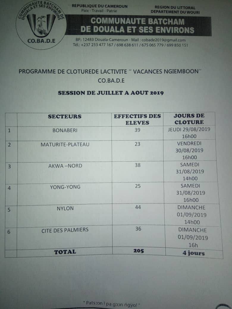 Les membres de la grande Communauté Batcham de Douala et ses environs sont informés que le Chef de la Communauté Serge FOAGUAM NOGNING présidera les cérémonies de clôture des cours d’apprentissage des langues selon le programme ci dessus.